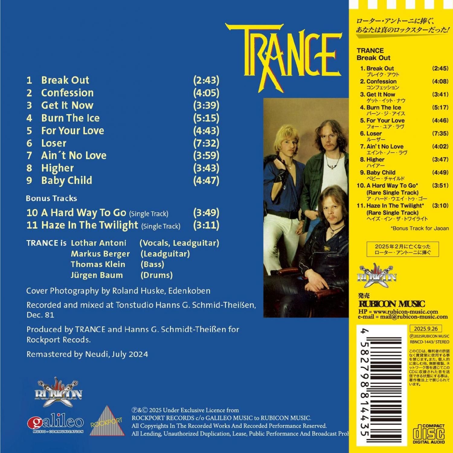 ジャーマン・メタルの超新星としてSCORPIONS、ACCEPTに続いてデビュー、初期2枚のアルバムを併せて合計で15万枚を売り上げながらレーベルトラブルやPOWER/THRASH METALの台頭で徐々に失速してしまった悲運のバンドTRANCE。その彼らの衝撃的だった1982年のデビュー作『Break Out』が遂に日本盤として初のリリースとなる。