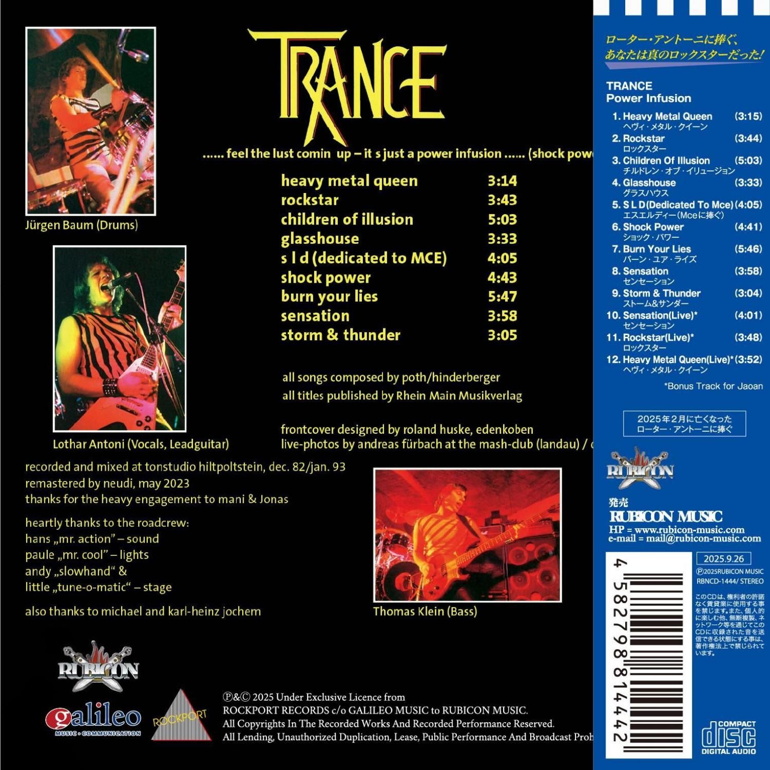 結成45年を迎えた現在も初期メンバーのマーカス・バーガー(g)とトーマス・クライン(b)を中心に活動を続けるTRANCEだが残念な事にオリジナル・メンバーのローター・アントーニが今年2025年2月に亡くなってしまいました。その彼に捧げて当時の貴重な激レア・ライヴ音源3曲をボーナストラックとして収録!!