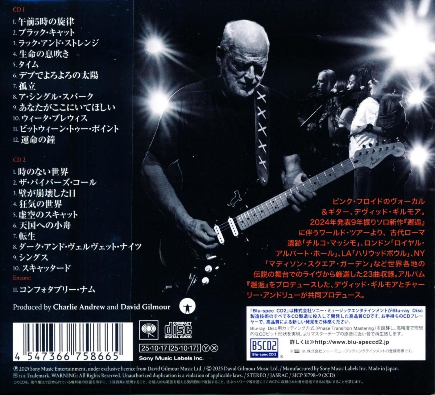 ピンク・フロイドのヴォーカル&ギター、デヴィッド・ギルモア。全英No.1他全世界9か国で初登場1位を獲得した、9年振りの新作『邂逅』 (Luck and Strange)(2024年発表)に伴うワールド・ツアーの模様が早くも商品化、2枚組CDは世界各地でのライヴ(ローマ、ロンドン、LA、NY)からベスト・テイクを収録。