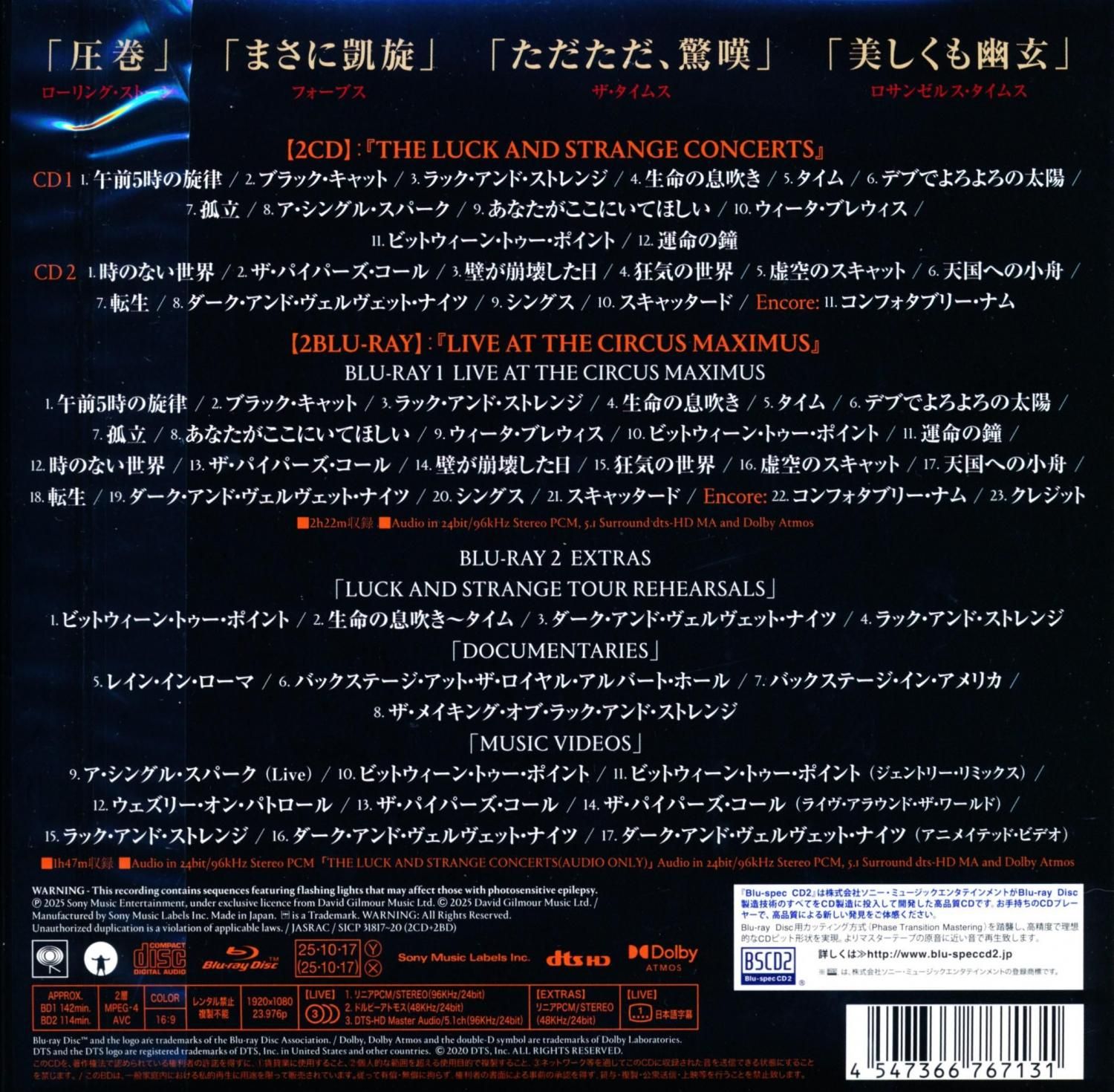 【日本のみ2CD+2BD 4枚組7インチ紙ジャケット仕様】ピンク・フロイドのヴォーカル&ギター、デヴィッド・ギルモア。全英No.1他全世界9か国で初登場1位を獲得した、9年振りの新作『邂逅』 (Luck and Strange)(2024年発表)に伴うワールド・ツアーの模様が早くも商品化、日本版独自パッケージの2CD+2BD 7インチ紙ジャケット仕様で発売が決定!2枚組CDは世界各地でのライヴ(ローマ、ロンドン、LA、NY)からベスト・テイクを収録。映像は2枚組BD、BD1にはイタリア・ローマの古代遺跡“チルコ・マッシモ”の公演を完全収録(2時間22分)。BD2には「EXTRA」としてツアー・リハーサル、ドキュメンタリー、ミュージックビデオの映像(1時間47分)とコンサートの音源をドルビーアトモス他で収録。日本盤特典としてポスター、セットリスト、ステッカーが封入されることも決定!2024年最新の“光と音の大スペクタクル・ショー”を音と映像で集大成した、すべての記録がここに。ギルモアのギターは天にも昇るが如く。桃源郷へと誘う、儚くも美しい夢幻の調べ。