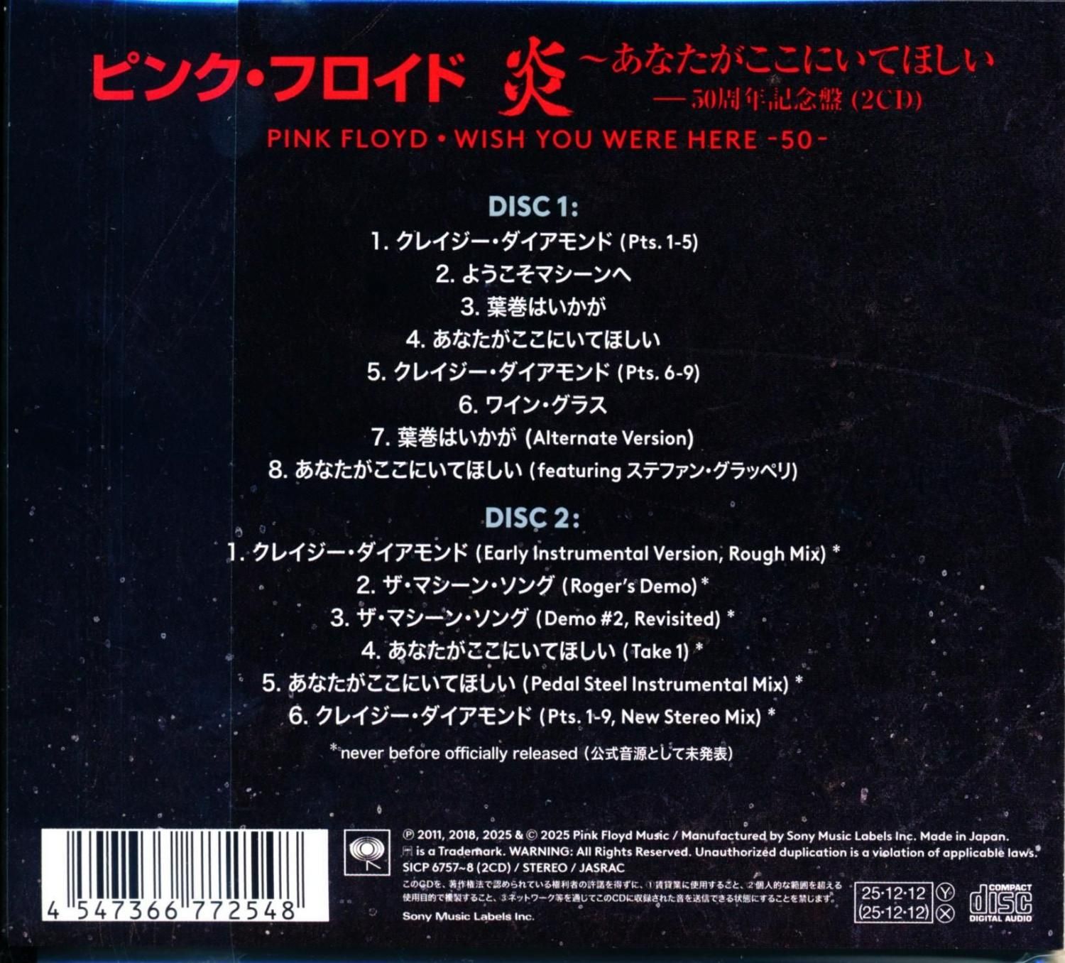ピンク・フロイドの名盤中の名盤、1975年発表『炎〜あなたがここにいてほしい』50周年記念盤が遂に発売!全世界トータル・アルバム・セールス2000万枚以上、英米初登場1位、日本でもオリコン8位を記録し大ヒットした、日本では『狂気』に次いで人気のある作品。2CDにはオリジナル盤(5曲)とともに、ボーナストラックとして、スタジオ・レアリティーズ9曲収録(うち6曲は完全未発表。4曲は新たにジェームス・ガスリーがニュー・リミックス)。