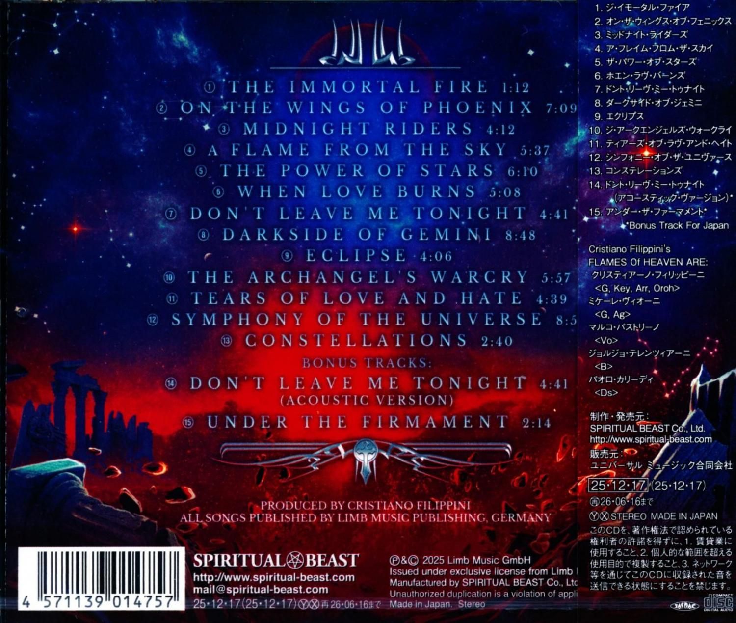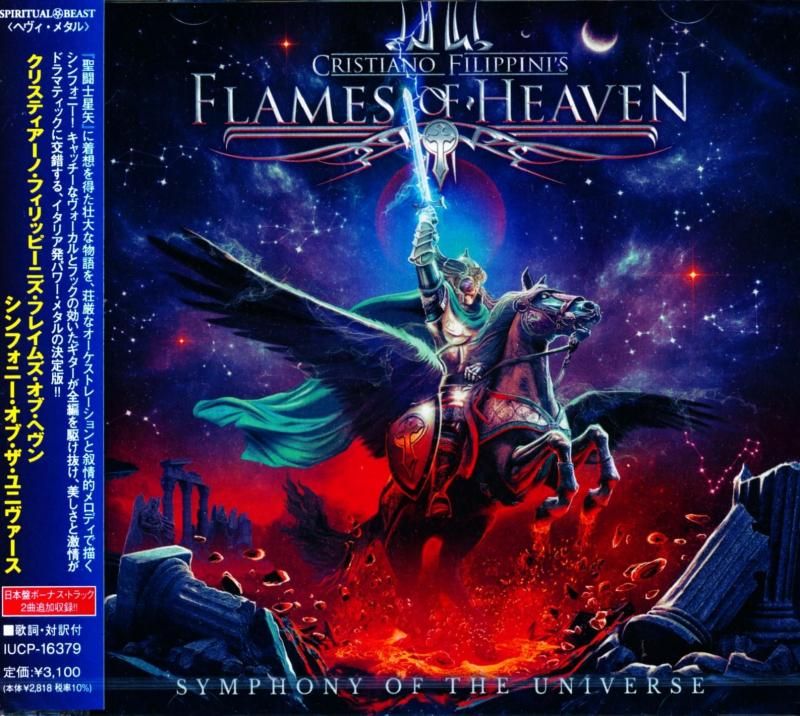 イタリアの作曲家/ギタリスト/オーケストレーター、クリスティアーノ・フィリッピーニによって2018年に結成されたメロディック・パワー・メタル・バンド。クラシック音楽とメタルを融合させた壮麗なサウンドを特徴とし、叙情とドラマが共存する独自の世界観で高く評価されている。2020年にリリースされたデビュー作『The Force Within』は、緻密なオーケストレーションとキャッチーなメロディが融合した完成度の高さで、ヨーロッパのメロディック・メタル・シーンやここ日本の熱心な音楽ファンの間でも話題となった。本作『Symphony of the Universe』はそれから5年を経て完成したセカンド・アルバムで、よりスケールの大きなサウンドと深みを増した叙情性を兼ね備えた作品となっている。テーマの多くは日本の人気漫画『聖闘士星矢』(車田正美)に着想を得ており、13曲中7曲がその世界観をもとに構築。英雄譚や内面の葛藤を壮大なメロディと荘厳なオーケストレーションで描いている。バンドの中心人物であるフィリッピーニは、法学士としてのキャリアを持ちながらも、2010〜2015年にかけて3枚のシンフォニック作品を発表し、オペラハウスや大聖堂で演奏を行うなど作曲家としても活躍。クラシックの理論を基盤にした緻密なアレンジが、バンドの音楽性をより格調高いものにしている。ラインナップには、TEMPERANCEやWONDERSなどでギターやソングライティング、ヴォーカルも担当するマルコ・パストリーノが専任ヴォーカルを務め、ギターには、ミケーレ・ヴィオーニ(VIVALDI METAL PROJECT)、ベースにジョルジョ・テレンツィアーニ(ARTHEMIS)、ドラムにはパオロ・カリーディ(Geoff Tate、Dave Ellefson、Reb Beachなどのツアー参加)といった熟練メンバーが集結している。プロデュースはクリスティアーノ本人が手がけ、ミックス&マスタリングはイタリアン・メタル界の名匠シモーネ・ムラローニ(DGM、RHAPSODY、TRICK OR TREAT、LABYRINTHなど)。壮大でありながら自然な音像を持つプロダクションが、バンドの持つメロディックな美しさを最大限に引き立てている。美旋律、情熱、クラシカルな構築美… それらが融合したフレイムズ・オブ・ヘヴンは、イタリアのメロディック・メタル伝統を継承しつつ、現代にその新たな息吹を吹き込む今後の活躍から目を離せない存在だ。日本盤は、ボーナス・トラック2曲追加してスピリチュアル・ビーストから発売。